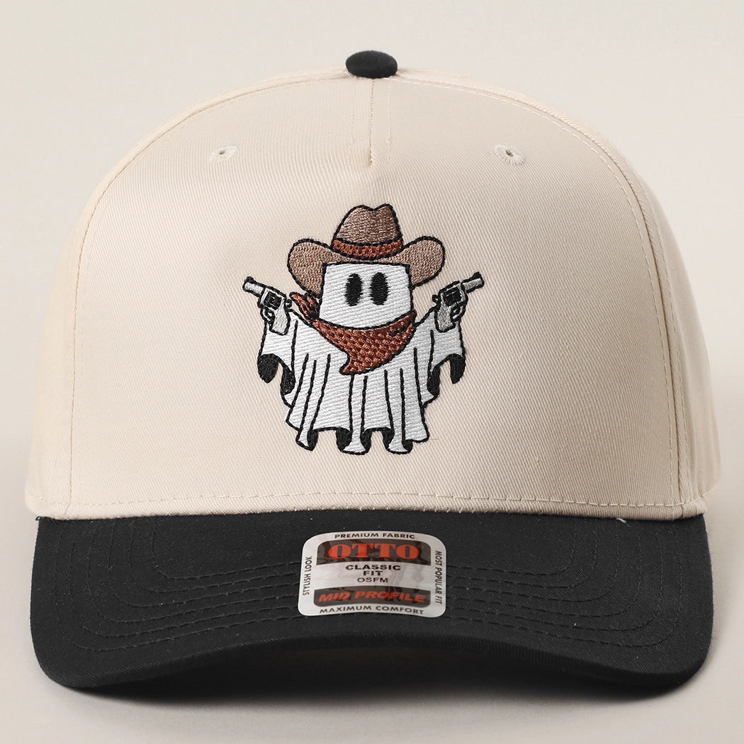 Spooky meets western in the Ghost Rider Hat. With a cream crown, black bill, and an embroidered cowboy ghost—complete with a hat, bandana, and dual pistols—this cap is perfect for anyone who loves a little playful edge to their style. Great for Halloween season or year-round western flair with a fun twist.